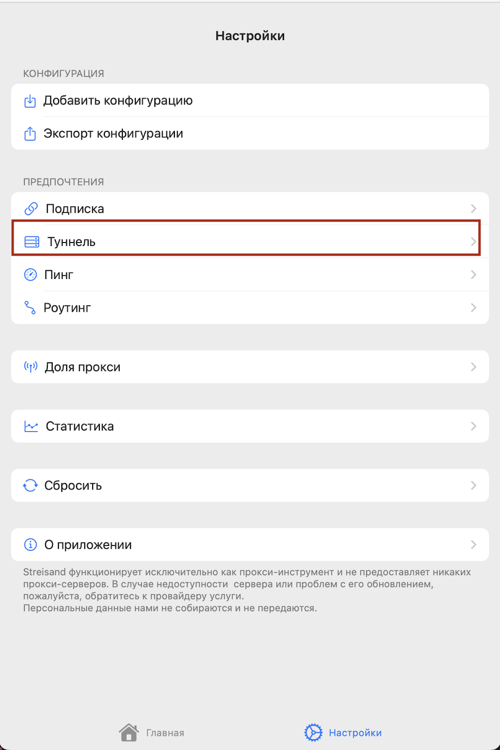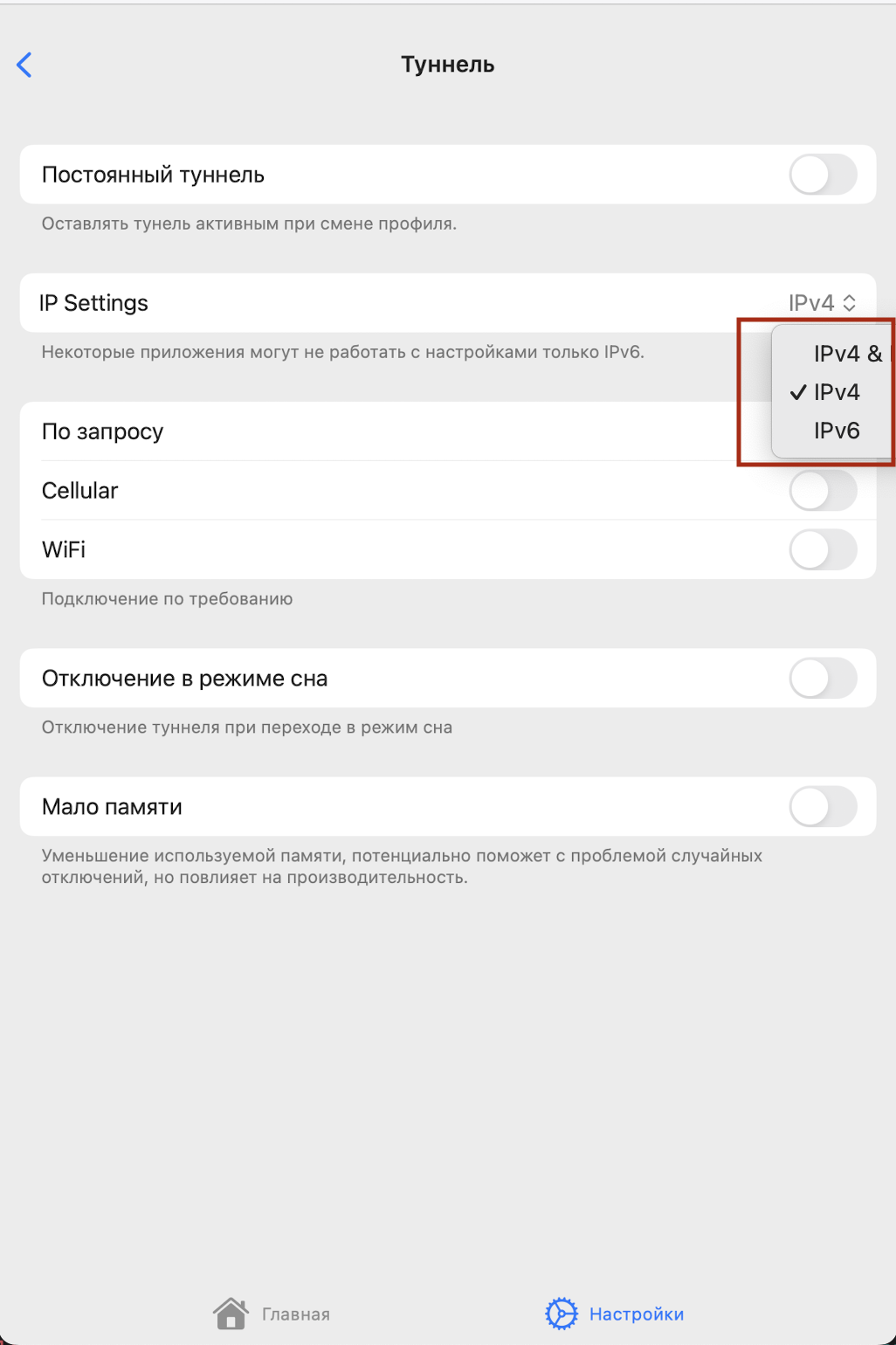 В приложении Streisand необходимо перейти в настройки, далее выбрать в меню "туннель", нажать IPSettings и в выпадающем списке выбрать IPv4.